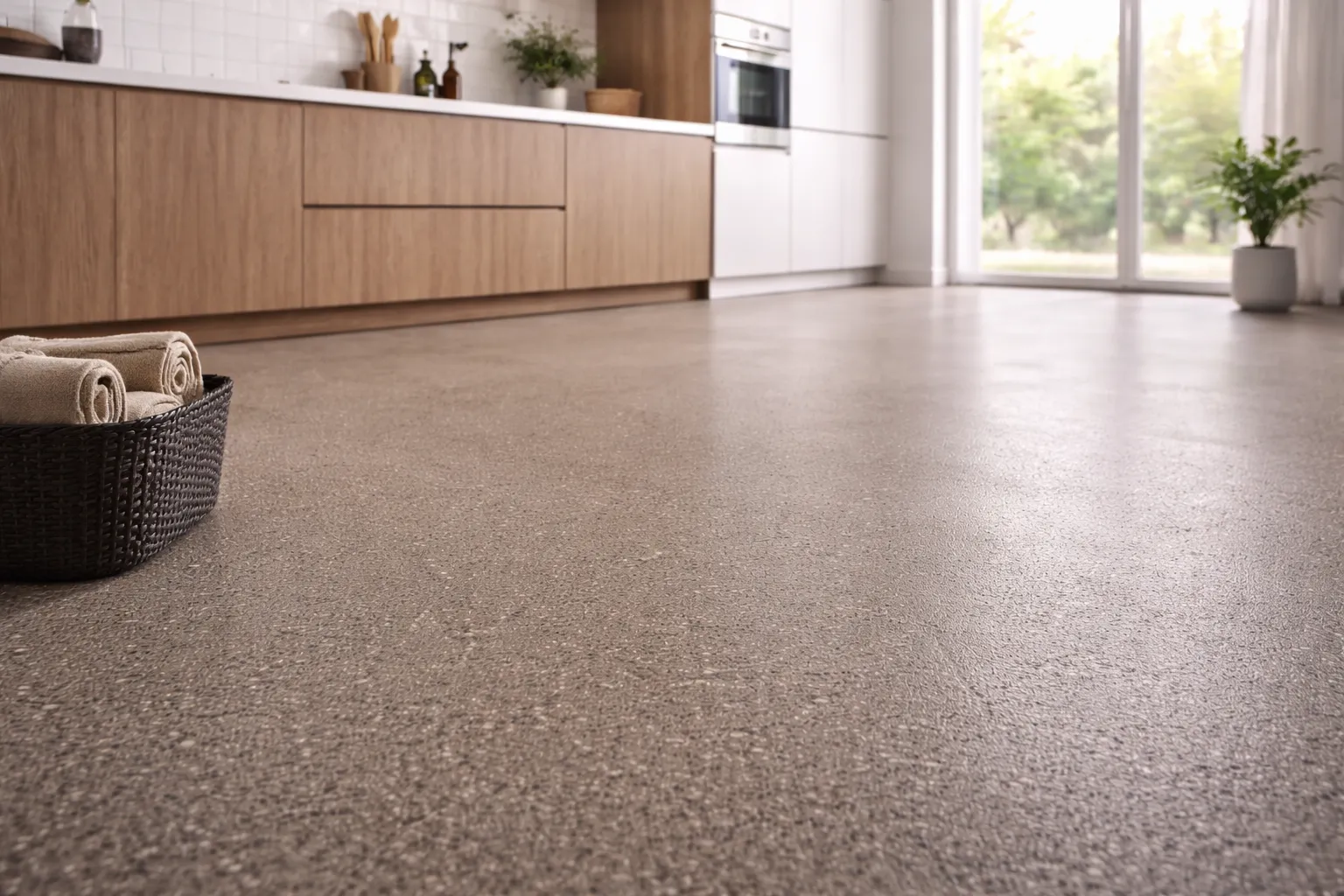 Dankzij de dichte structuur is de vloer bestand tegen morsen en vocht, ideaal voor praktische ruimtes.